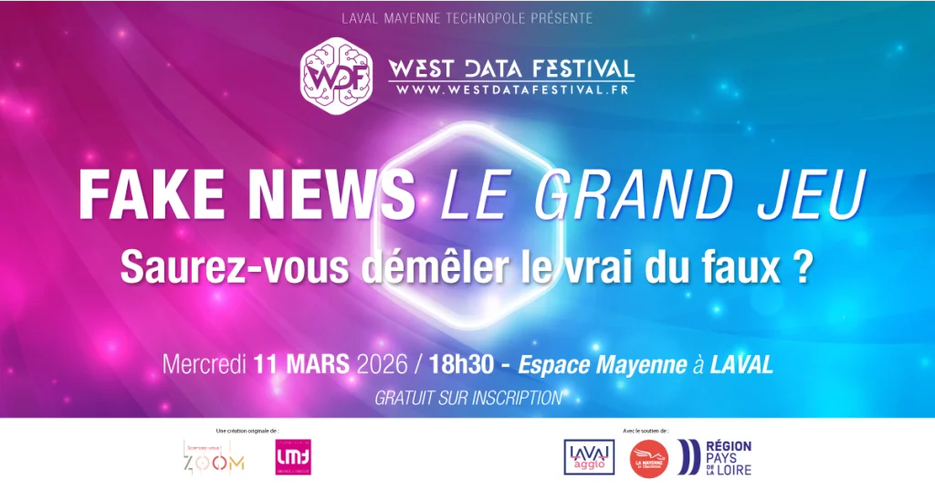 Dans le cadre du West Data Festival, participez à la soirée : Fake News : Le grand jeu ! Inspirée des jeux télévisés, le programme alternera entre quiz interactifs en direct, échanges avec des spécialistes, et se terminera par une grande finale sur scène avec des prix à gagner !